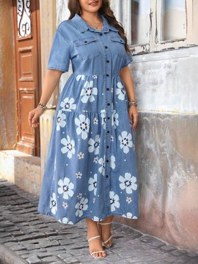 EMERY ROSE 大码女式浅蓝色水洗牛仔印花长裙,休闲度假夏季 - 淺色水洗藍 - 查看 1