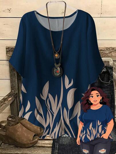 Rusticease 大码女式复古乡村树叶图案定位印花圆领插肩袖宽松衬衫,女式夏季服装 - 彩色 - 查看 1