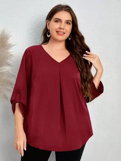 EMERY ROSE 大碼V領捲邊袖襯衫 - 酒紅色 - 查看 1