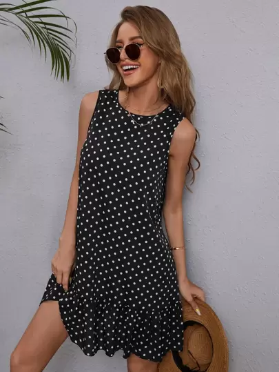 EMERY ROSE 波卡圓點荷葉邊連衣裙 - 黑色 - 查看 1