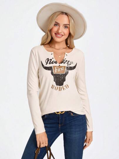 EMERY ROSE 春季杏色女款长袖音乐节图案 T 恤 - 杏色 - 查看 1
