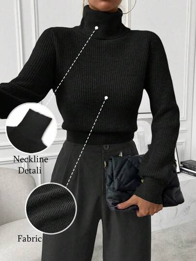 EMERY ROSE 高领罗纹针织毛衣,长袖套头针织衫,秋冬毛衣 - 黑色 - 查看 1