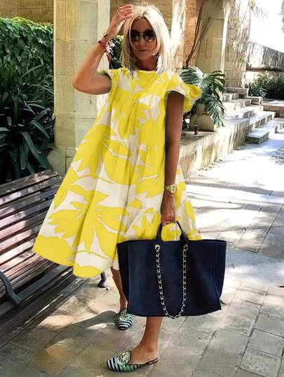 EMERY ROSE 度假休闲植物花卉印花盖袖连衣裙 - 黃色 - 查看 1