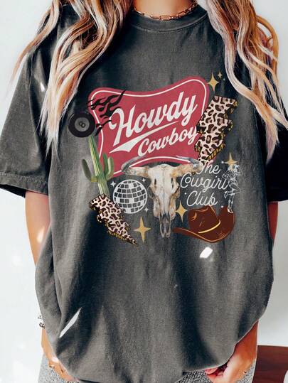EMERY ROSE 西部风情图案T恤,灵感源自牛仔竞技表演,复古乡村音乐会风格,印花圆领休闲女式T恤,轻薄透气,适合春夏穿着。 - 深灰色 - 查看 1