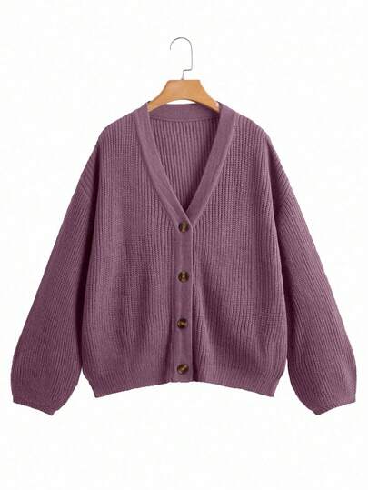 EMERY ROSE 白色灯笼袖纽扣前襟罗纹宽松针织开衫,春夏款 - 藕粉色 - 查看 1