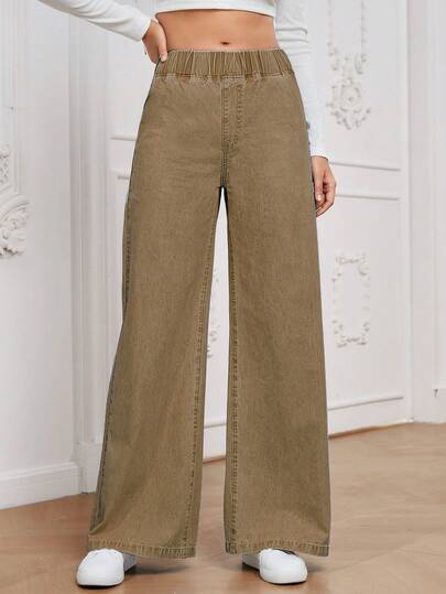 EMERY ROSE 女士百搭休闲高腰阔腿宽松轻薄牛仔蓝梭织裤 - 咖啡棕 - 查看 1