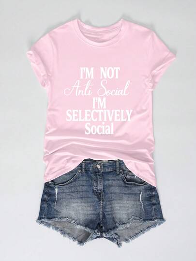 EMERY ROSE 女士休闲标语字母图案夏季圆领T恤,图案T恤,女士上衣,穿着舒适