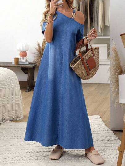 EMERY ROSE 女式休闲水洗不对称领长款牛仔连衣裙 - 藍色 - 查看 1