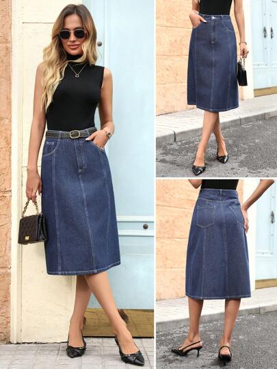 EMERY ROSE 女士休闲水洗中长牛仔 A 字裙 - 深色水洗藍 - 查看 1