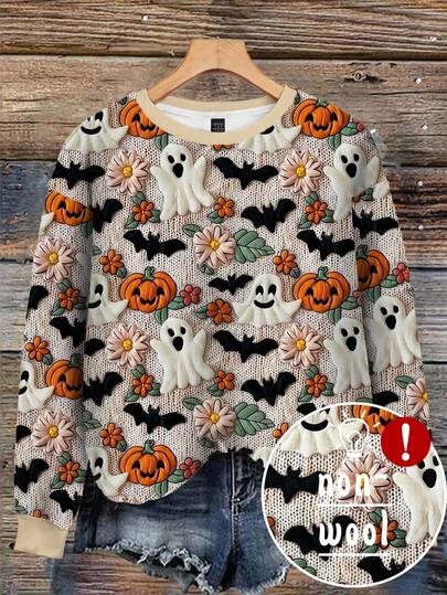 EMERY ROSE 女士万圣节幽灵、南瓜和蝙蝠印花插肩长袖套头卫衣秋季卫衣 - 彩色 - 查看 1