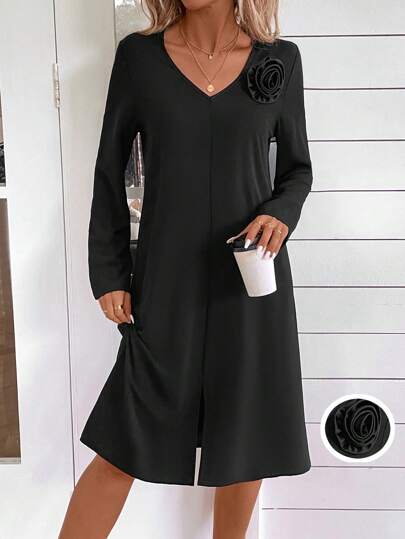 EMERY ROSE 女士长袖花卉装饰连衣裙 - 黑色 - 查看 1