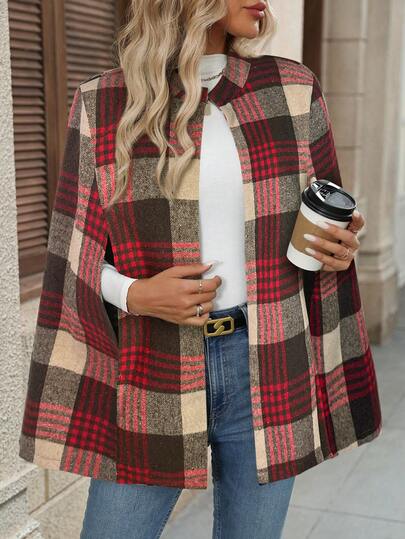 EMERY ROSE 女士格子披肩袖优雅宽松羊毛大衣,秋冬款