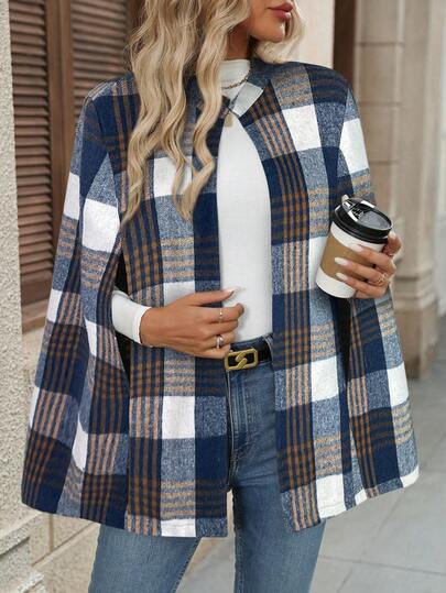 EMERY ROSE 女士格子披肩袖优雅宽松羊毛大衣,秋冬款 - 藍色 - 查看 1