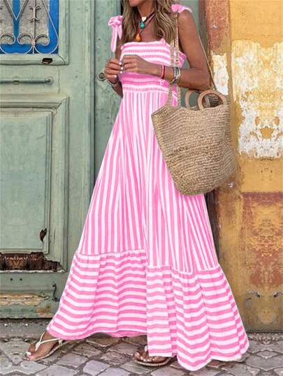 EMERY ROSE 女式肩带胸前褶皱条纹长裙度假海滩装 - 粉色 - 查看 1