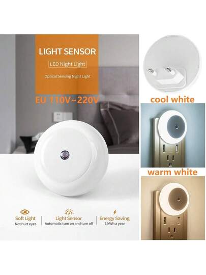 Eu 110~220v,帶智慧感應裝置,0.5w插頭式led壁燈,適用於臥室、浴室、走廊、樓梯或任何暗房,柔和明亮。(圓形)白光/暖白光 - 白色 - 查看 8