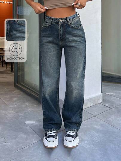 EURMUSE 100%纯棉高腰直筒Y2K风格牛仔裤 - 深色水洗藍 - 查看 1