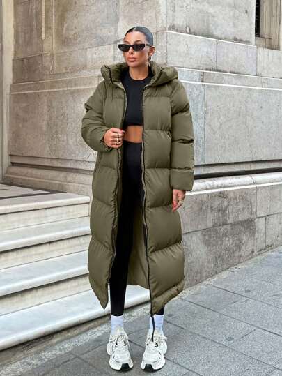 EURMUSE 对比色拉链和拉链头细节,保暖功能长款羽绒冬季外套 - 軍綠色 - 查看 1