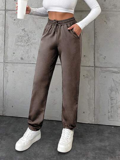 EURMUSE 棉质女式抽绳腰部口袋慢跑裤 - 摩卡棕 - 查看 1