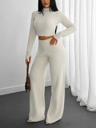 EURMUSE 女士舒适罗纹针织套装 - 长袖套头衫和宽松阔腿裤 - 杏色 - 查看 1