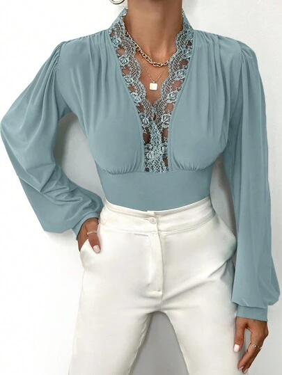 EURMUSE Guipure Lace Insert Lantern Sleeve Blouse - 綠色 - 查看 1