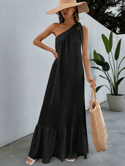 EURMUSE 单肩系带荷叶边长连衣裙 - 黑色 - 查看 1