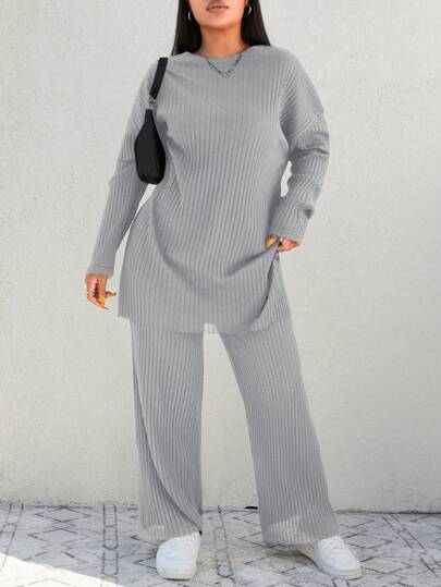 EURMUSE 大碼落肩袖下擺開叉T恤和褲子 - 淺灰色 - 查看 1