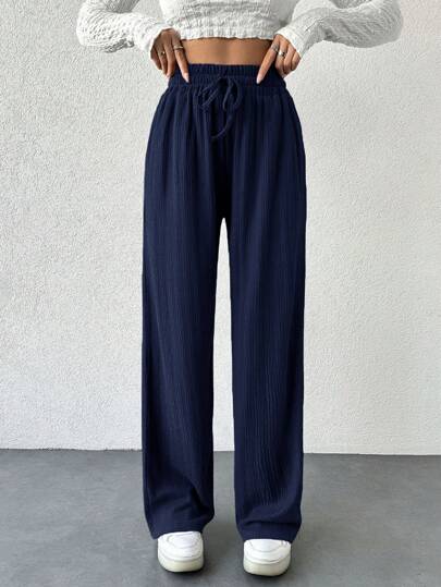 EURMUSE 女款休閒寬腿褲配有彈性腰帶和束帶,H形設計 - 藏蓝色 - 查看 1
