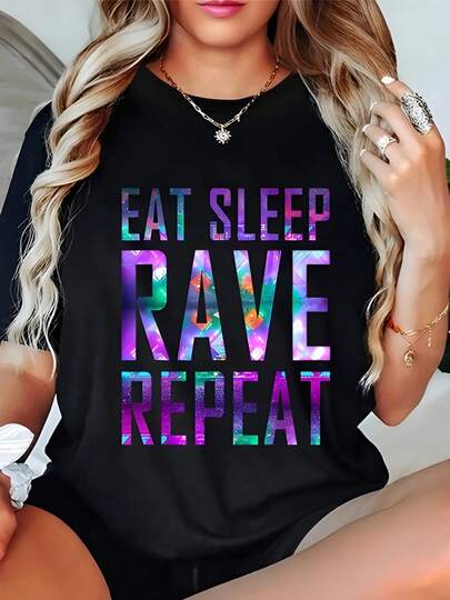 Eat Sleep Rave Repeat Graphic Black T - Shirt,220g Cotton Women's Casual Printed T-Shirt, Crew Neck Pullover Short-Sleeve - 黑色 - 查看 1
