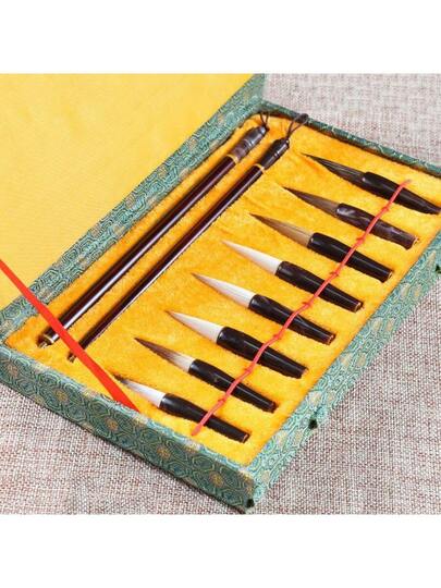 八頭可拆卸書法毛筆套裝,野狼毛/山羊毛/野兔毛適合初學者和成人用 - 復古花紋套盒 - 查看 10
