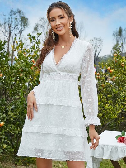 Eilly Bazar 花卉刺繡荷葉袖荷葉邊連衣裙 - 白色 - 查看 1