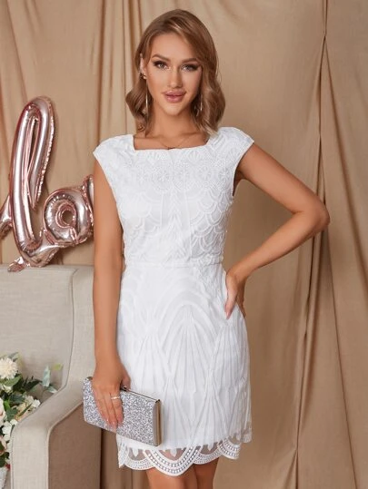 Eilly Bazar 方領貝殼邊蕾絲覆蓋連衣裙 - 白色 - 查看 1