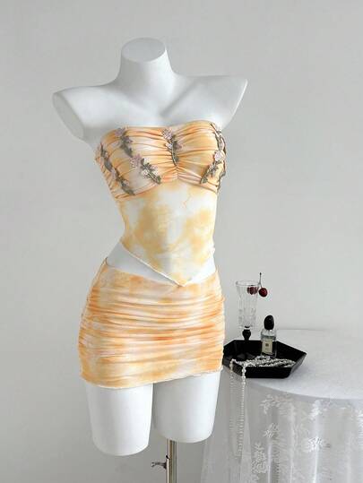 Elamini 2件套休闲度假3D花卉褶饰抹胸上衣和迷你裙,春夏 - 黃色 - 查看 2