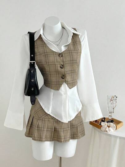 Elamini 返校格子V领纽扣设计背心和低腰百褶裙套装 - 棕色 - 查看 1