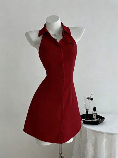 Elamini 白色无袖刺绣修身A字连衣裙,春夏款 - 酒紅色 - 查看 5