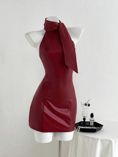 Elamini 酒红色 PU 皮革复古性感别致露背系带腰身修身迷你连衣裙 - 酒紅色 - 查看 1