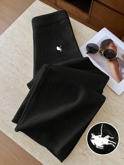 Elamini 女式休闲百搭户外白色刺绣长款系带针织毛衣裤 - 黑色 - 查看 1