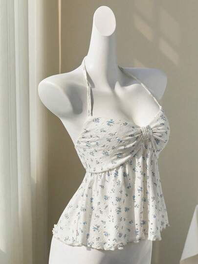 Elamini 黄色精致碎花镂空V领性感露背无袖短款上衣,春夏 - 彩色 - 查看 1