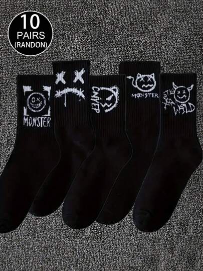 10 双带食尸鬼脸印花的男士中筒袜,适合日常穿着、运动、篮球、黑白、春秋、秋季 - 黑色 - 查看 1