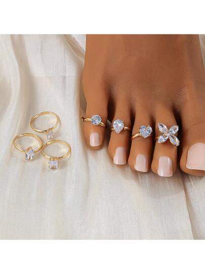 7 件/套可调节女士夏季沙滩趾环,镶嵌闪亮心形和泪珠仿钻戒指,适合日常、派对、节日佩戴 - 款式2 - 查看 6