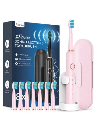 成人和儿童电动牙刷,黑色充电式牙刷,带 8 个刷头的电动牙刷,5 种模式,2 分钟计时器 - 粉色 - 查看 1