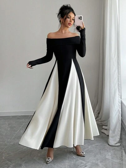 Chiquease 女士秋冬露肩撞色腰 A 字长袖连衣裙长款女装 - 黑色 - 查看 1