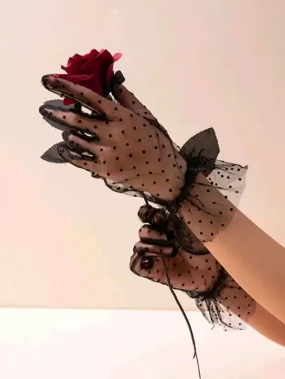优雅 1 双女士波尔卡圆点图案手套,适合派对万圣节情人节 - 黑色 - 查看 4