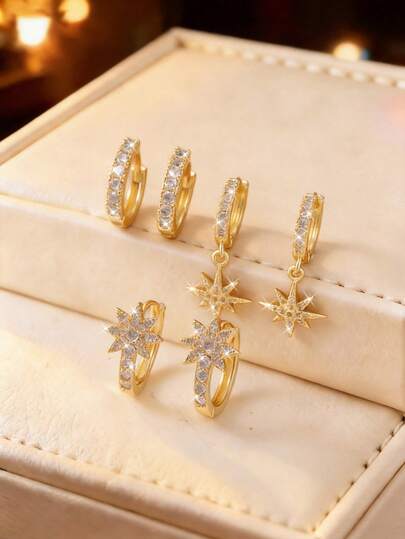 优雅星空金色三环耳环套装 - 微型锆石星芒和几何造型耳环 | 适合派对和节日佩戴的百搭耳环