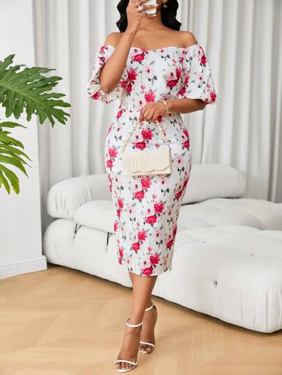 SHEIN Clasi 夏季优雅花卉印花露肩紧身连衣裙 - 彩色 - 查看 1