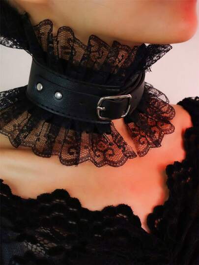 优雅哥特吸血鬼魅力颈链黑色蕾丝和PU皮革颈部束带腰带万圣节紧身胸衣情人节情人节 - 黑色 - 查看 12