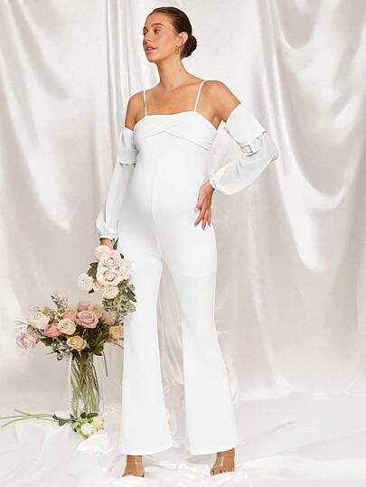 MaterniChic 優雅孕婦派對露肩長袖緊身連體褲,胸前交叉設計 - 白色 - 查看 1