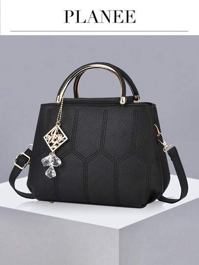 优雅绗缝细节手提包,时尚双手柄工作包,女士仿皮单肩包,手提包单肩斜挎包 - 黑色 - 查看 1
