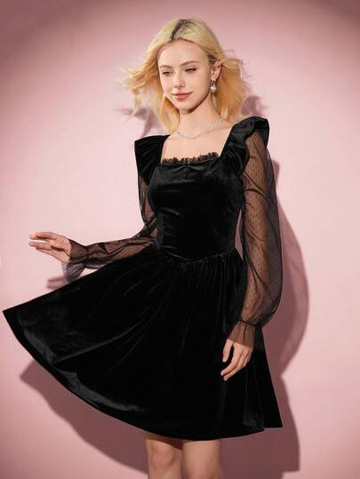 优雅天鹅绒束腰连衣裙,黑色,荷叶边网袖,秋冬 - 黑色 - 查看 1
