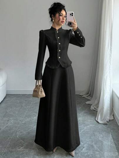 Elenzga 2 件套:女士优雅拼接流苏夹克和裙子 - 黑色 - 查看 1