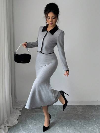 Elenzga 女士有领撞色纽扣优雅休闲通勤衬衫和松紧腰鱼尾下摆半身裙两件套 - 灰色 - 查看 1